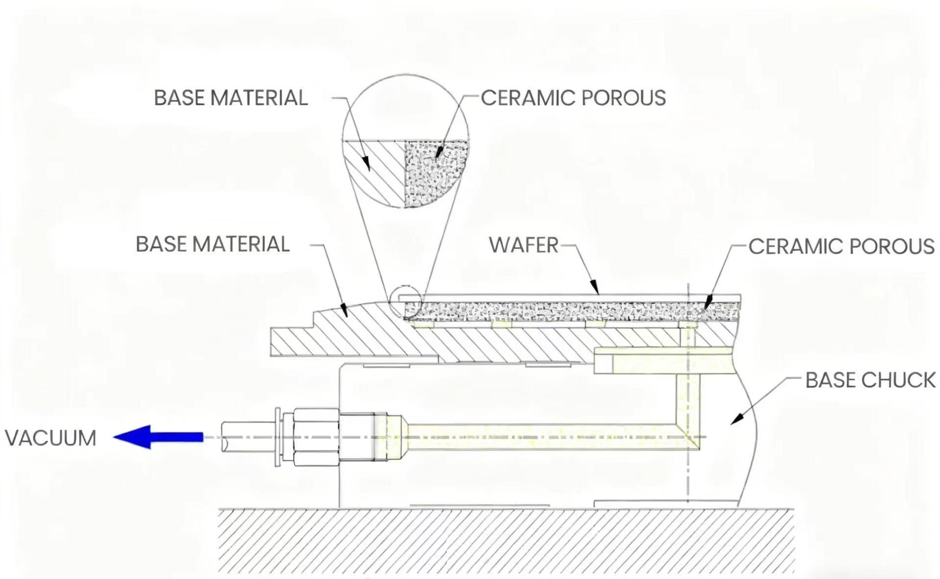 अनुकूलितछिद्रपूर्ण सिरेमिक चकआधार र छिद्रपूर्ण सिरेमिक प्लेट समावेश गर्दछ। भ्याकुम प्रणालीमा जडान गर्दा, कम-दबाव वातावरण वेफर र सिरेमिक बीचको हावा खाली गरेर सिर्जना गरिन्छ। भ्याकुम नकारात्मक दबाब अन्तर्गत, वेफर चक सतहमा दृढतापूर्वक टाँसिएको छ, अन्ततः सुरक्षित र स्थिर निर्धारण र स्थिति प्राप्त गर्दै।