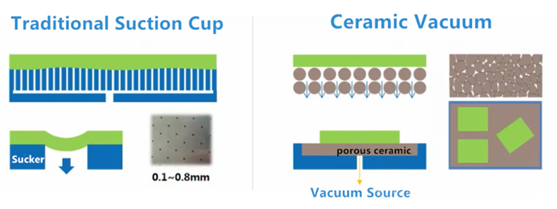 परम्परागत धातु चकहरूमा असमान सक्शन बल हुन्छ, पातलो सामग्रीहरूमा विरूपण हुने सम्भावना हुन्छ, एन्टि-स्टेटिक गुणहरूको अभाव हुन्छ, र तिनीहरूको कम कठोरताको कारणले झर्ने र च्यात्ने सम्भावना हुन्छ। सिरेमिक भ्याकुम चकहरू, अर्कोतर्फ, पातलो भागहरूको लागि उपयुक्त छन्, एन्टि-स्टेटिक गुणहरू प्रस्ताव गर्छन्, र पहिरन-प्रतिरोधी र जंग-प्रतिरोधी छन्।